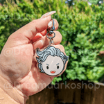 -Keychains are made of acrylic, have an epoxy overlay and come with a gun metal swivel lobster clasp attachment. Designs are different on each side. Size is 2" 🗡️